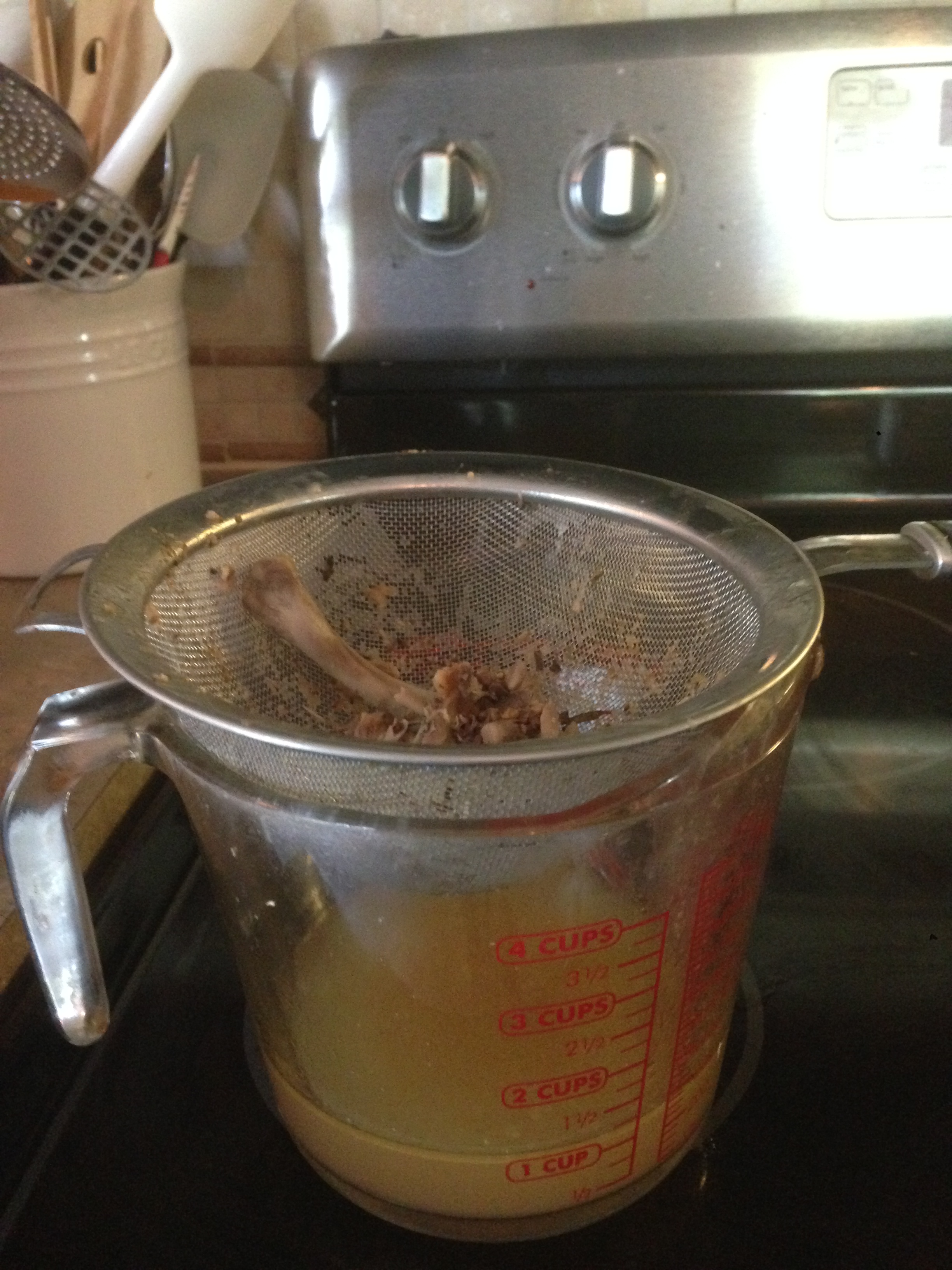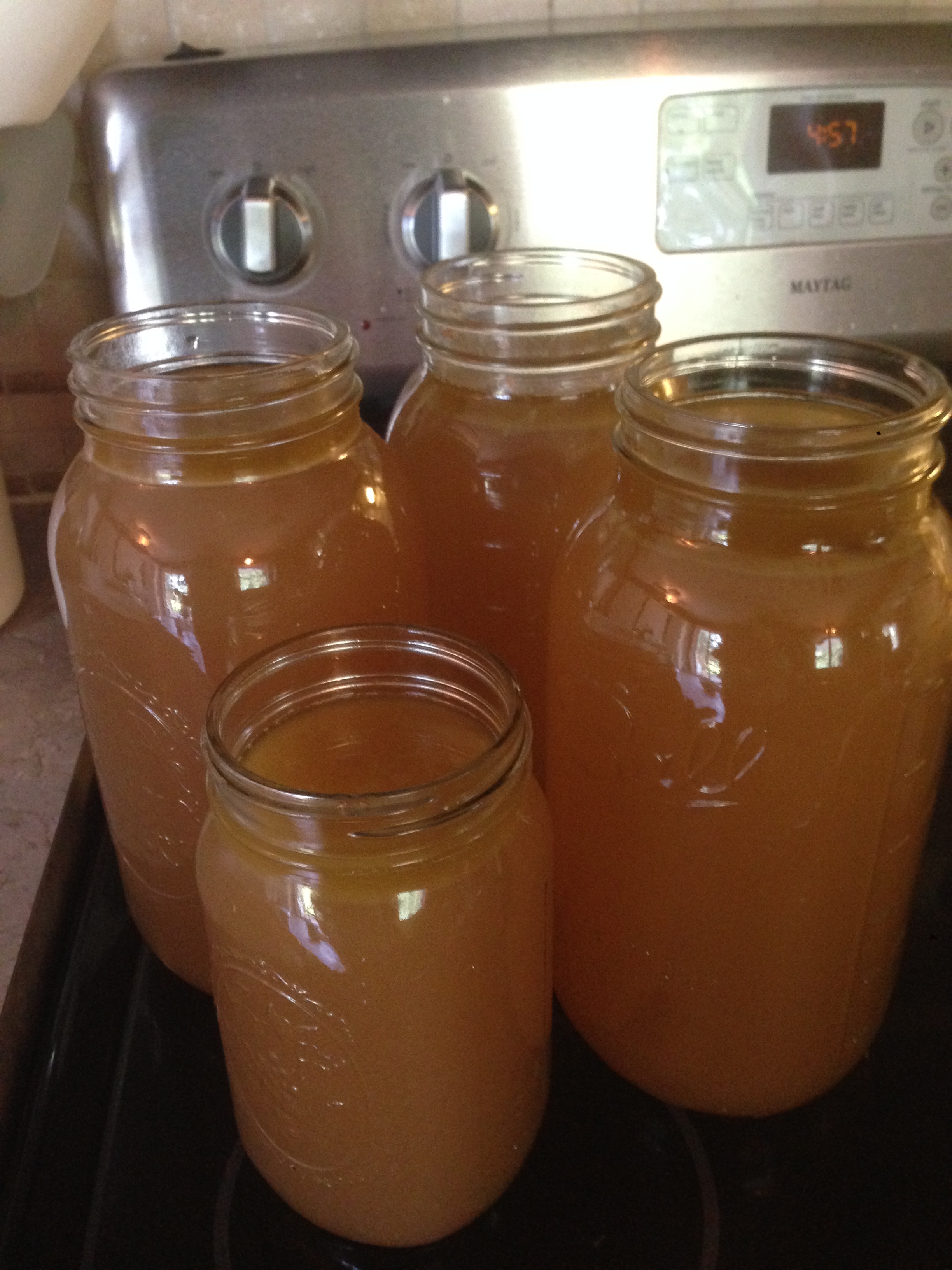 This next step is kind of messy (sort of like de-boning a chicken which is not my favorite task. I don’t like getting all greasy, but I do it anyway…..) I let the broth cool a bit, and when it’s warm I take a metal strainer (not your good nylon strainer that you use in ferments…..they will melt). Put the strainer over a large measuring cup and ladle the broth through the strainer. The strainer catches all of the bones and such to be thrown away. Then pour the broth into quart or half gallon jars. If you are going to freeze part of your broth do NOT use half gallon jars. We have broken several….they don’t seem to handle the freezer well. Fill your quart sized jars up about 3/4 way up, leaving plenty of room for expansion when it freezes. Glass will crack in the freezer if your jars are too full. The pics below I am not planning to freeze, so I have them filled clear to the top.